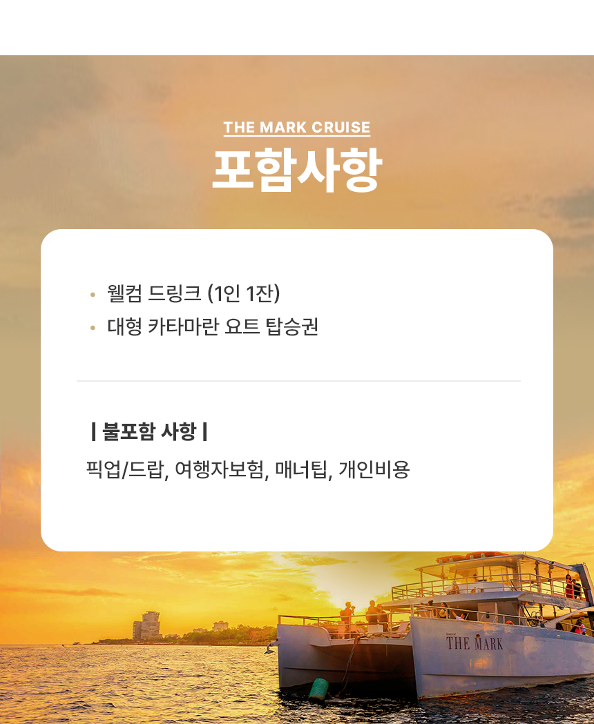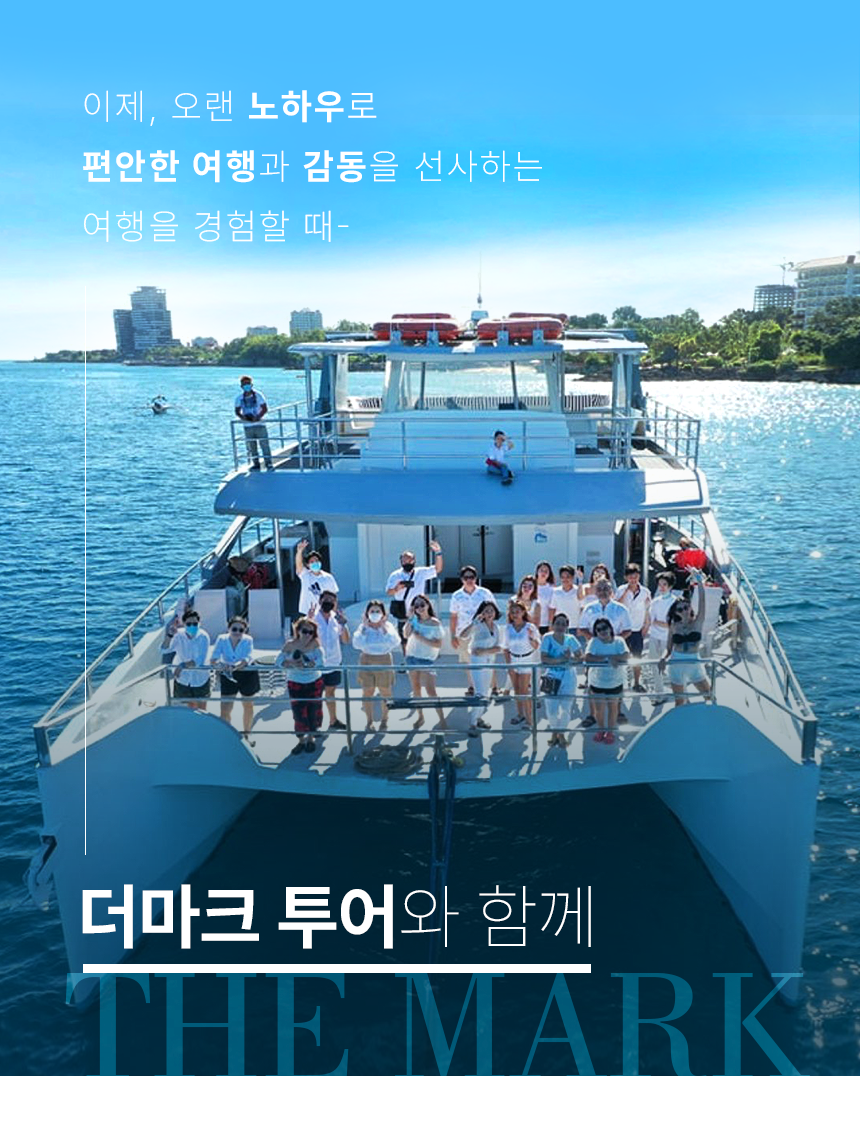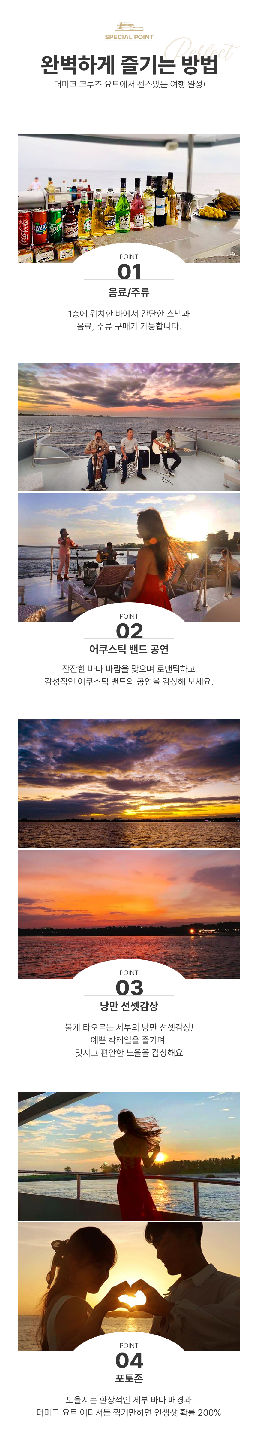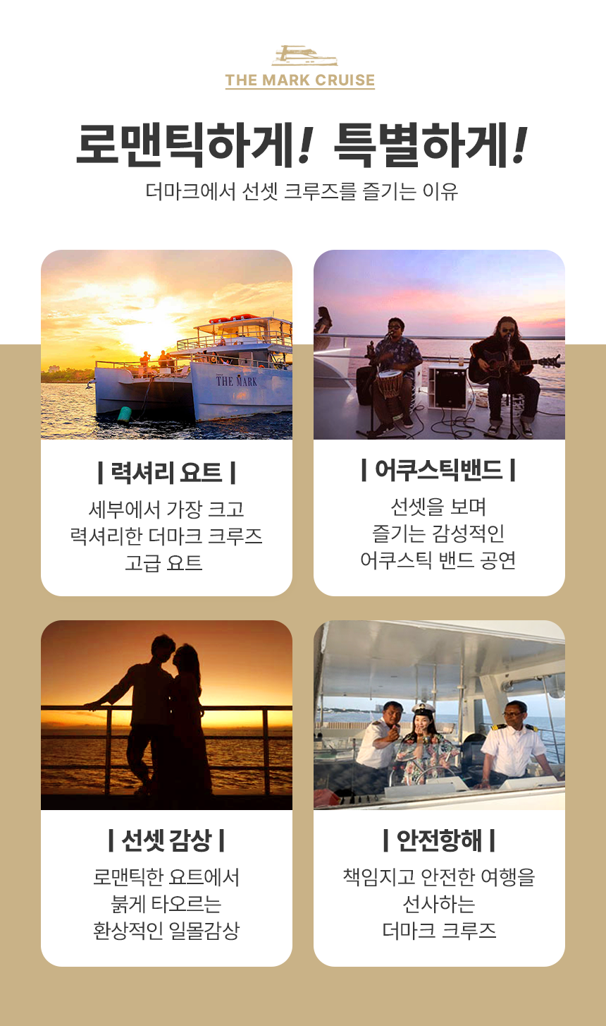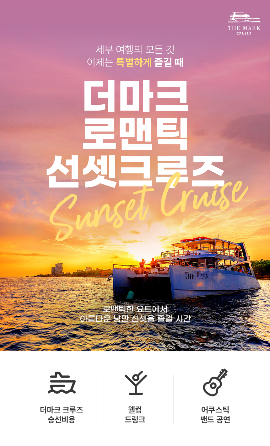 세부에서 가장 로맨틱한 순간 크루즈에서 선셋을 감상하며 세부여행의 마무리 크루즈에서 감미로운 라이브밴드의 음악과 와인, 칵테일을 즐겨보세요 ^^ ☑️ 카타마란형 대형 크루즈로 여유롭고 편안한 투어 ☑️ 다채로운 열대과일과 스낵 + 바텐더가 즉석에서 만들어드리는 칵테일! ☑️ 어딜가나 포토존, 더마크 크루즈에서 꼭 인생샷 남기세요! ☑️ 남 / 녀 구분된 화장실로 더이상 불편하지 않으셔도 됩니다. ☑️ 어쿠스틱밴드의 라이브를 들으며 아름다운 선셋 감상! 소중한 시간을 내어 세부로 온 고객님들 크루즈에 탑승한 순간부터 내리시는 그 순간까지 고객님들의 모든 시간을 소중하게 저희 더마크가 책임지겠습니다.