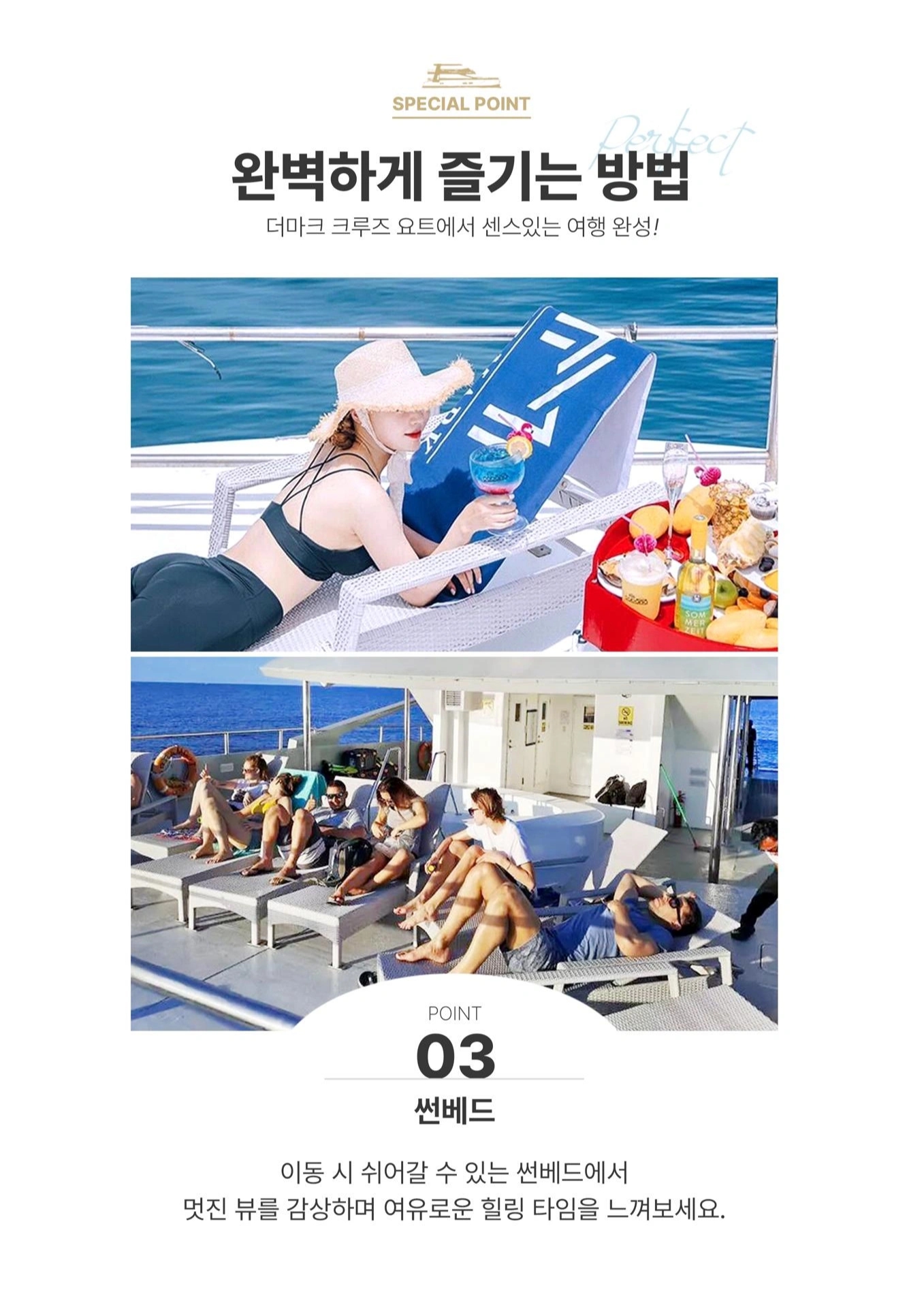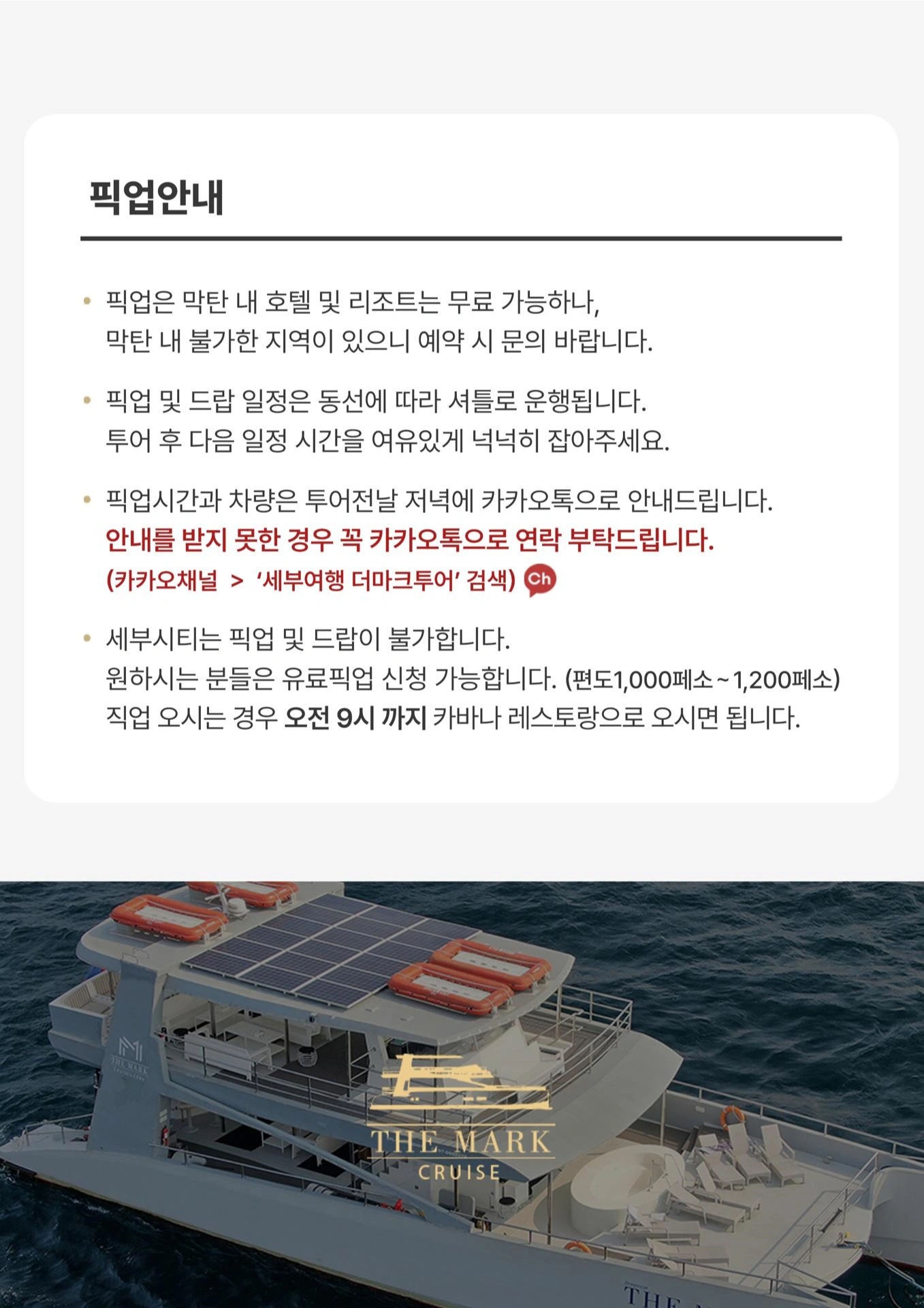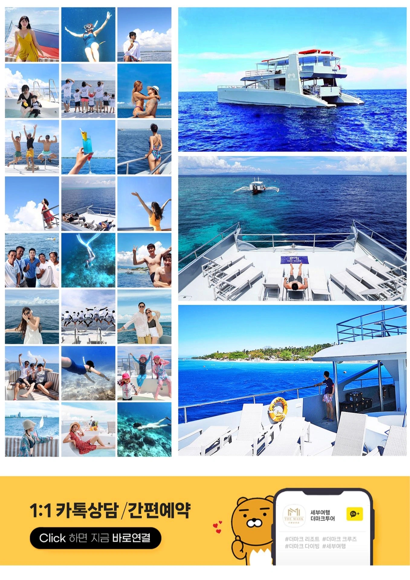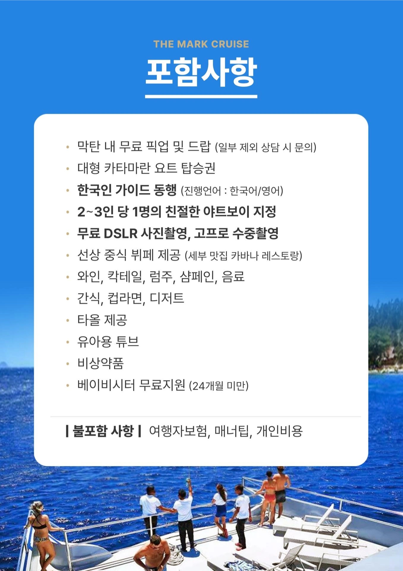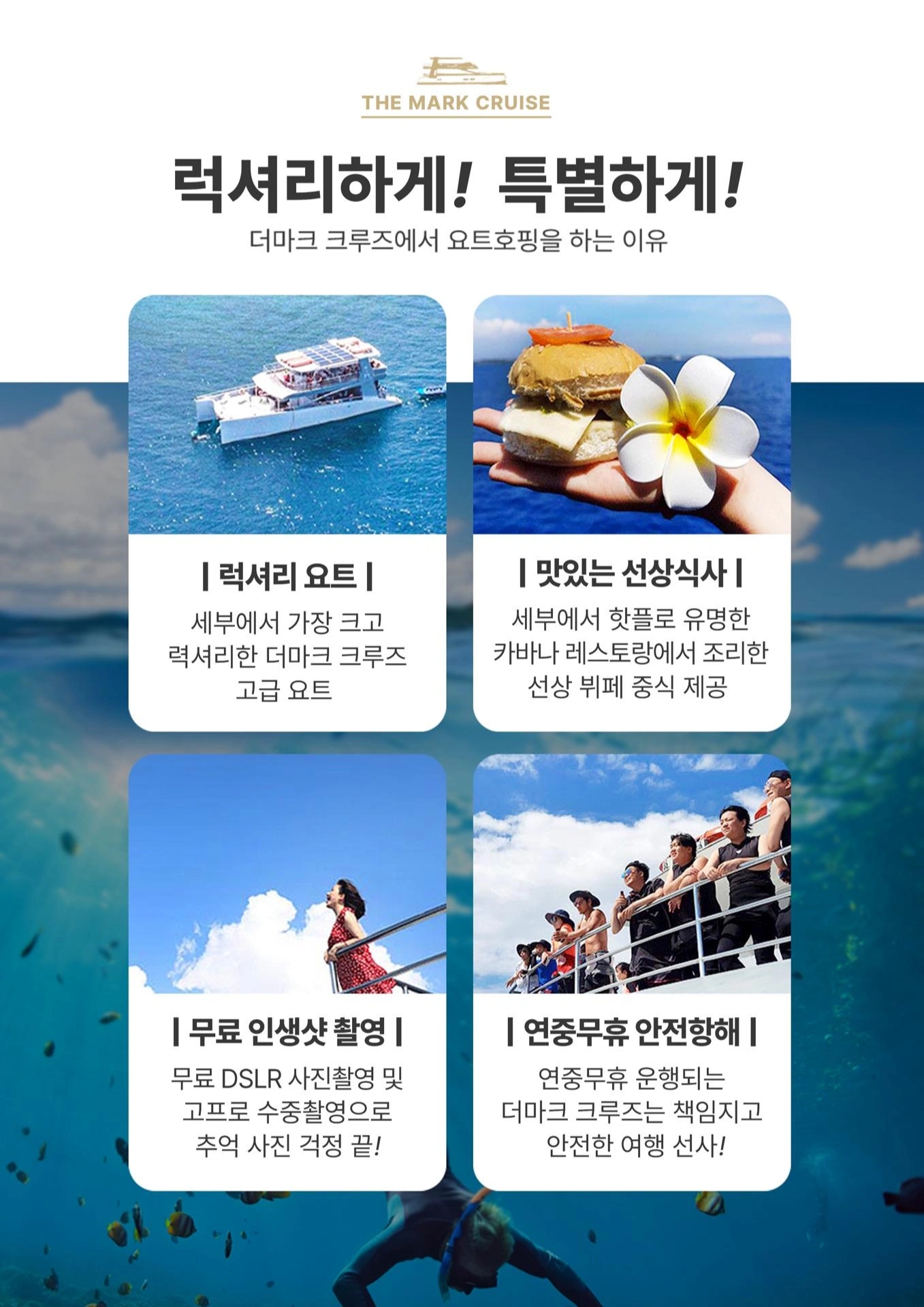 ✈ 비행기에 퍼스트 클래스가 있듯이 🚢 호핑에도 퍼스트 클래스가 있습니다. 더마크와 함께라면 바다 위 멋진 요트에서 여유로움+호핑까지 즐기실 수 있습니다:) ☑️ 카타마란형 대형 크루즈로 여유롭고 편안한 투어 ☑️ 세부 맛집 카바나레스토랑에서 준비해드리는 풍성한 점심 ☑️ 다채로운 열대과일과 스낵 + 바텐더가 즉석에서 만들어드리는 칵테일! ☑️ 이동중에도 자쿠지에서 아이들의 신나는 시간 ☑️ 어딜가나 포토존, 더마크 크루즈에서 꼭 인생샷 남기세요! ☑️ 남 / 녀 구분된 화장실로 더이상 불편하지 않으셔도 됩니다. ☑️ 이동중에 요트위 썬베드에서 태닝을 즐겨보세요! ☑️ 캐녀닝에서나 할 수 있는 멋진 다이빙! 소중한 시간을 내어 세부로 온 고객님들 크루즈에 탑승한 순간부터 내리시는 그 순간까지 고객님들의 모든 시간을 소중하게 저희 더마크가 책임지겠습니다.